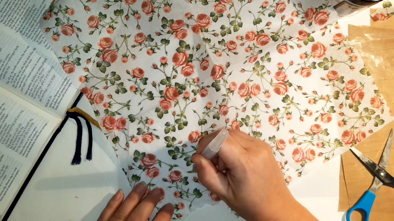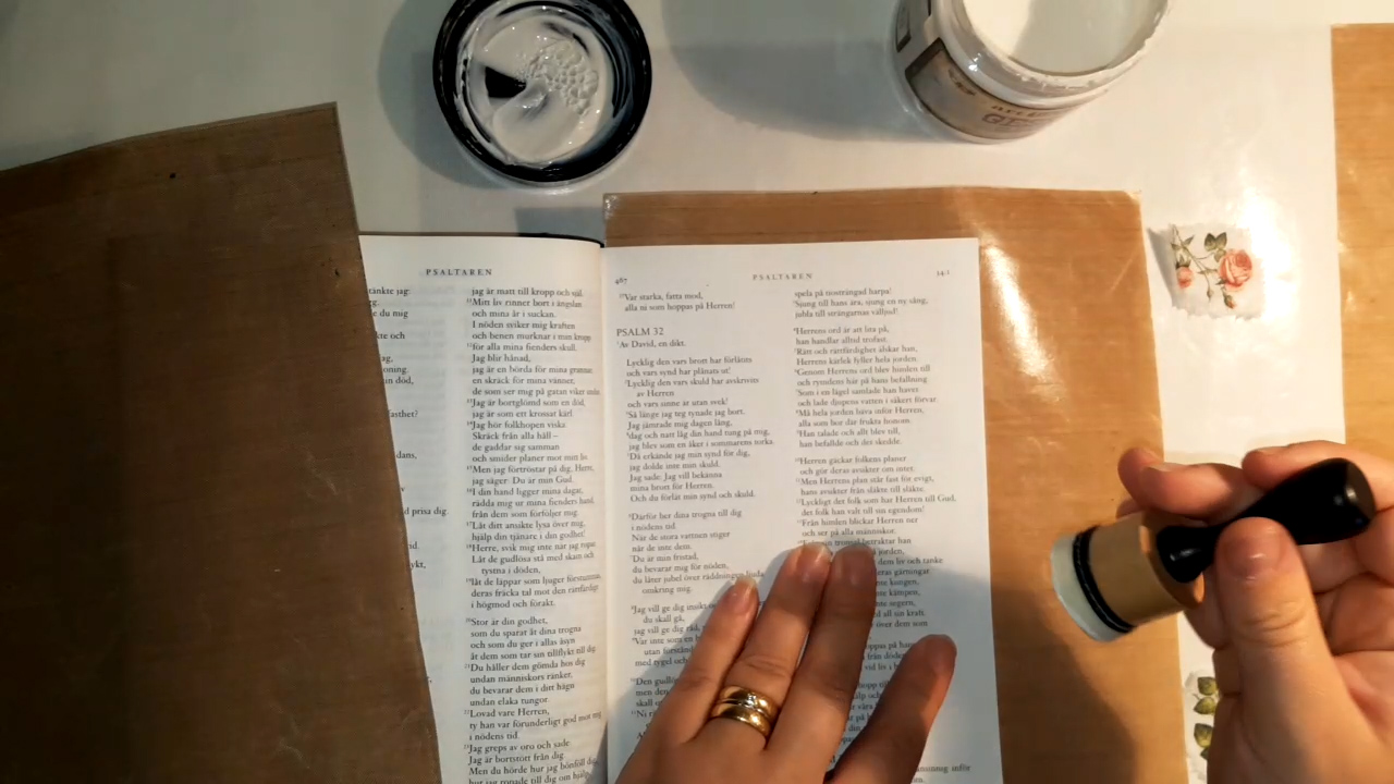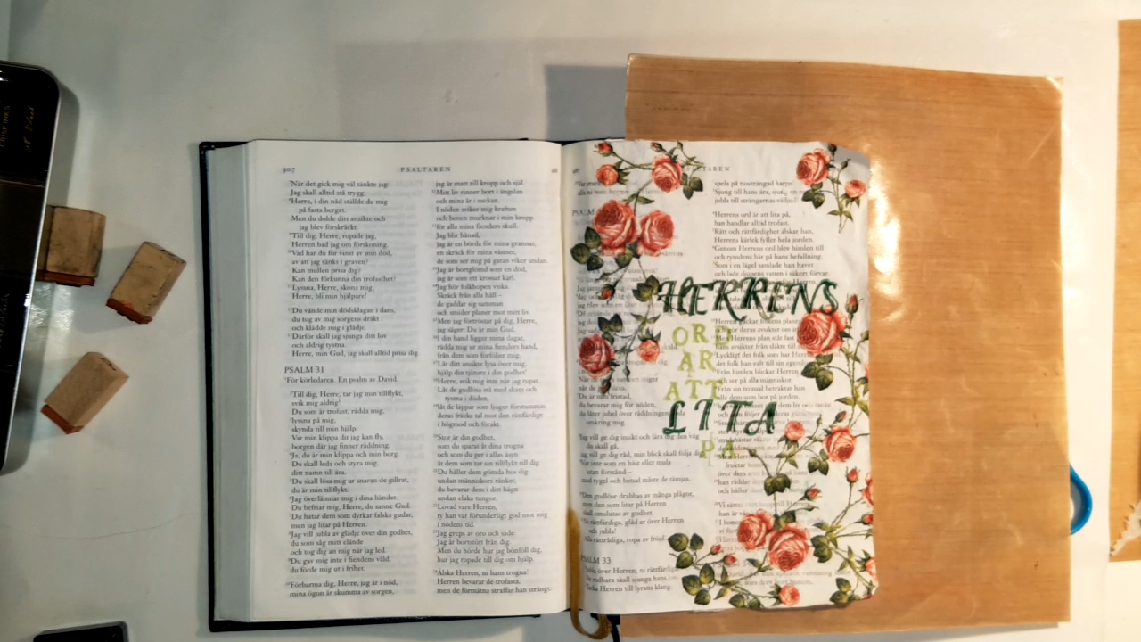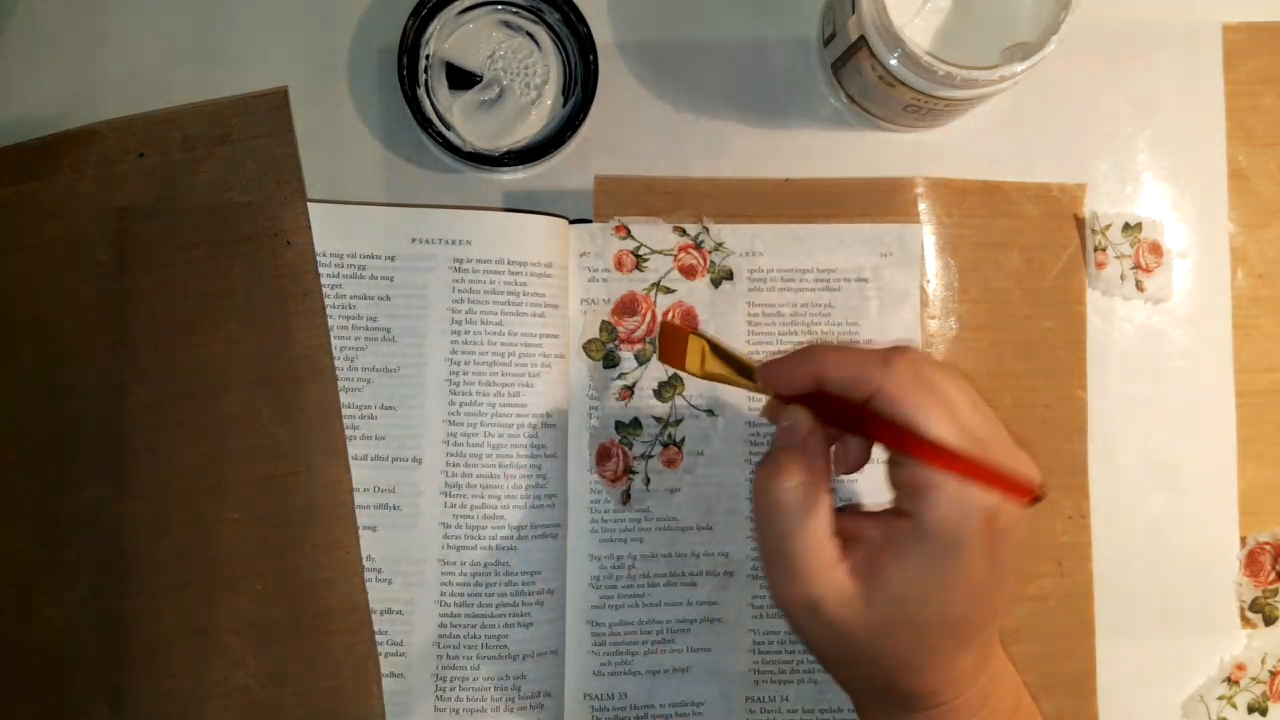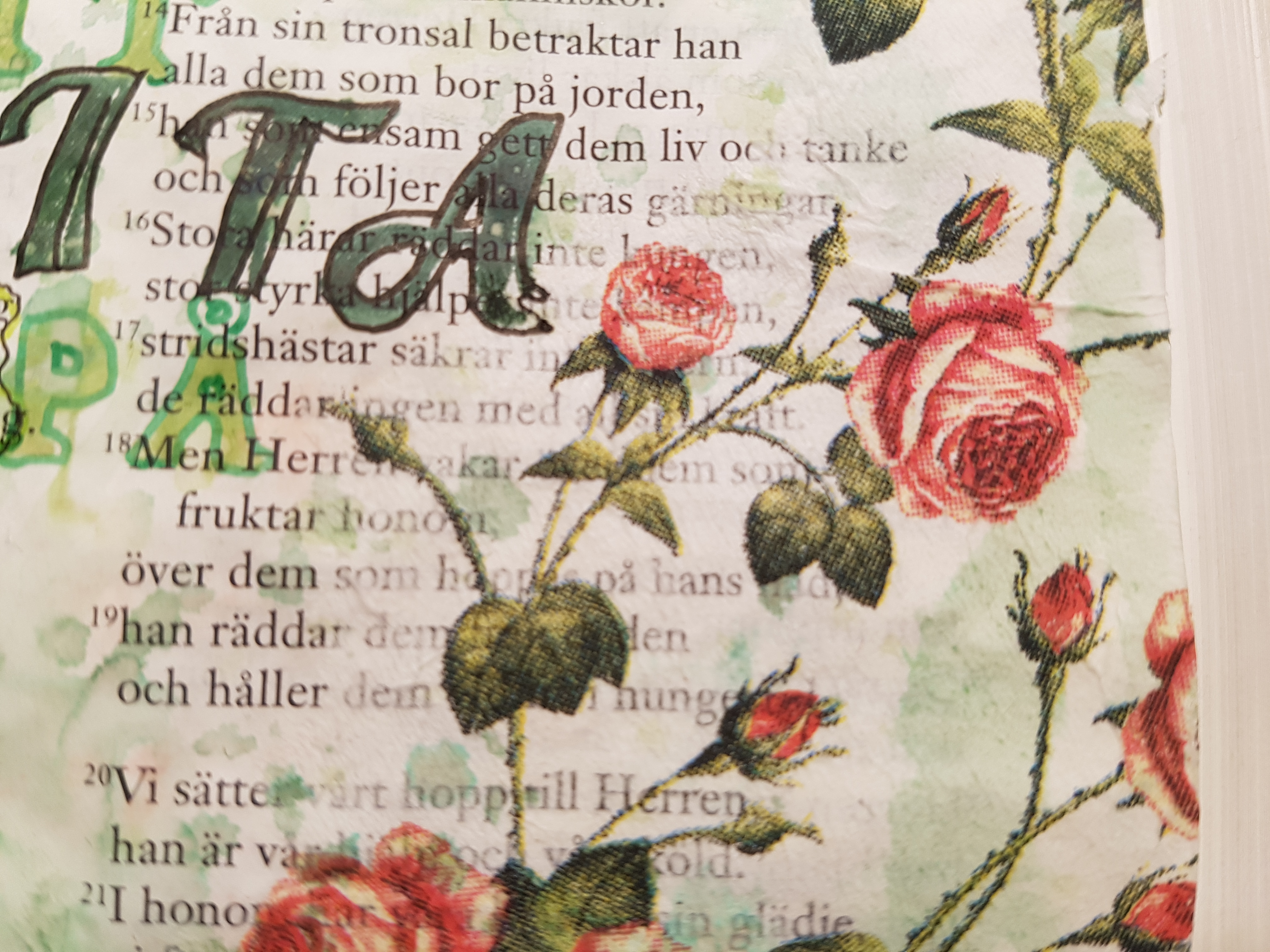 När jag har arrangerat mina blommor och vet hur jag vill ha mina servettdelar är det dags att limma. Oftast när jag har gjort decopage tidigare har jag använt Mod Podge, men jag rekommenderar inte att ni gör det. För det första blir inte ytan helt klibbfri, och för det andra är (min) Mod Podge blank “glossy”. Båda dessa egenskaper leder till att det är stor risk att sidorna i din bibel klistrar ihop sig. Det finns många lim och medium man kan använda. Jag kommer idag använda min vanliga Art Basics Clear Gesso, som jag använder nästan jämt för att grunda sidorna i min bibel. Den fungerar utmärkt för detta, och det är ett basmedium för alla som vill använda mer än typ färgpennor i sin bible journaling, och sist men inte minst: det går utmärkt att måla, stämpla, rita mm på gesson utan att oroa sig för att färgen blöder igenom eller inte fastnar.