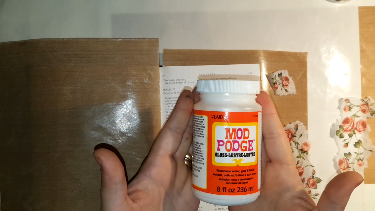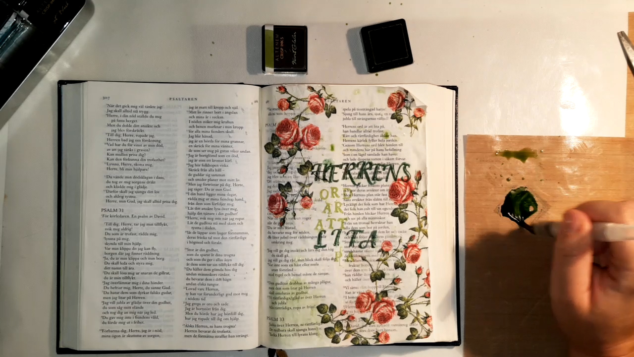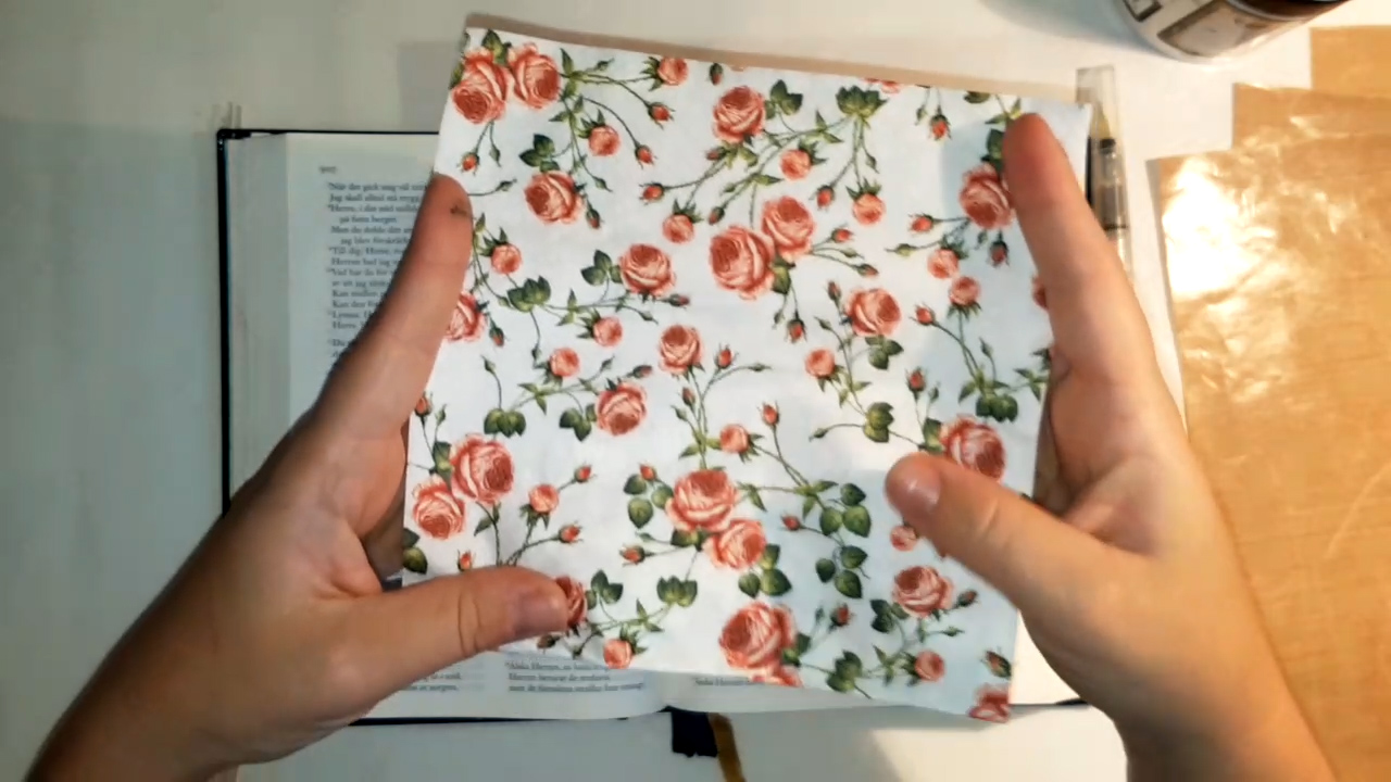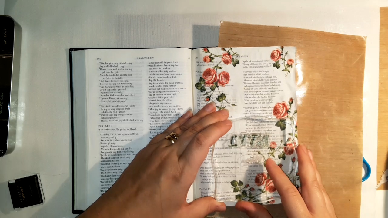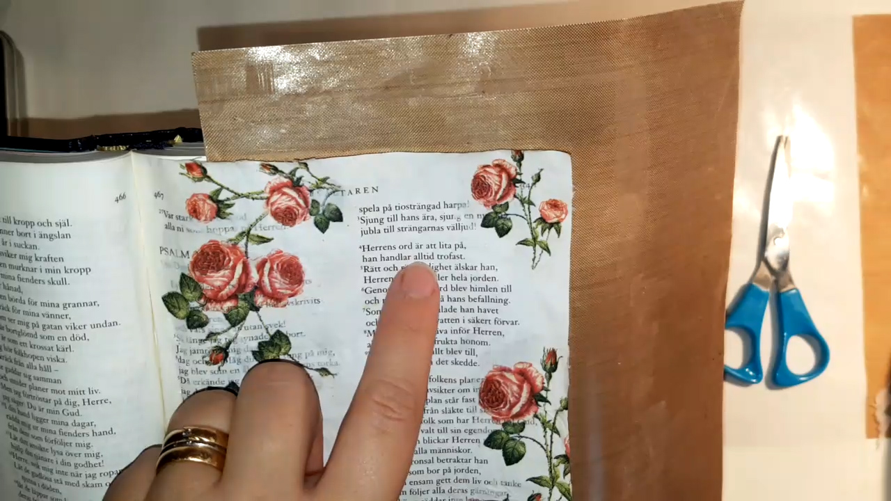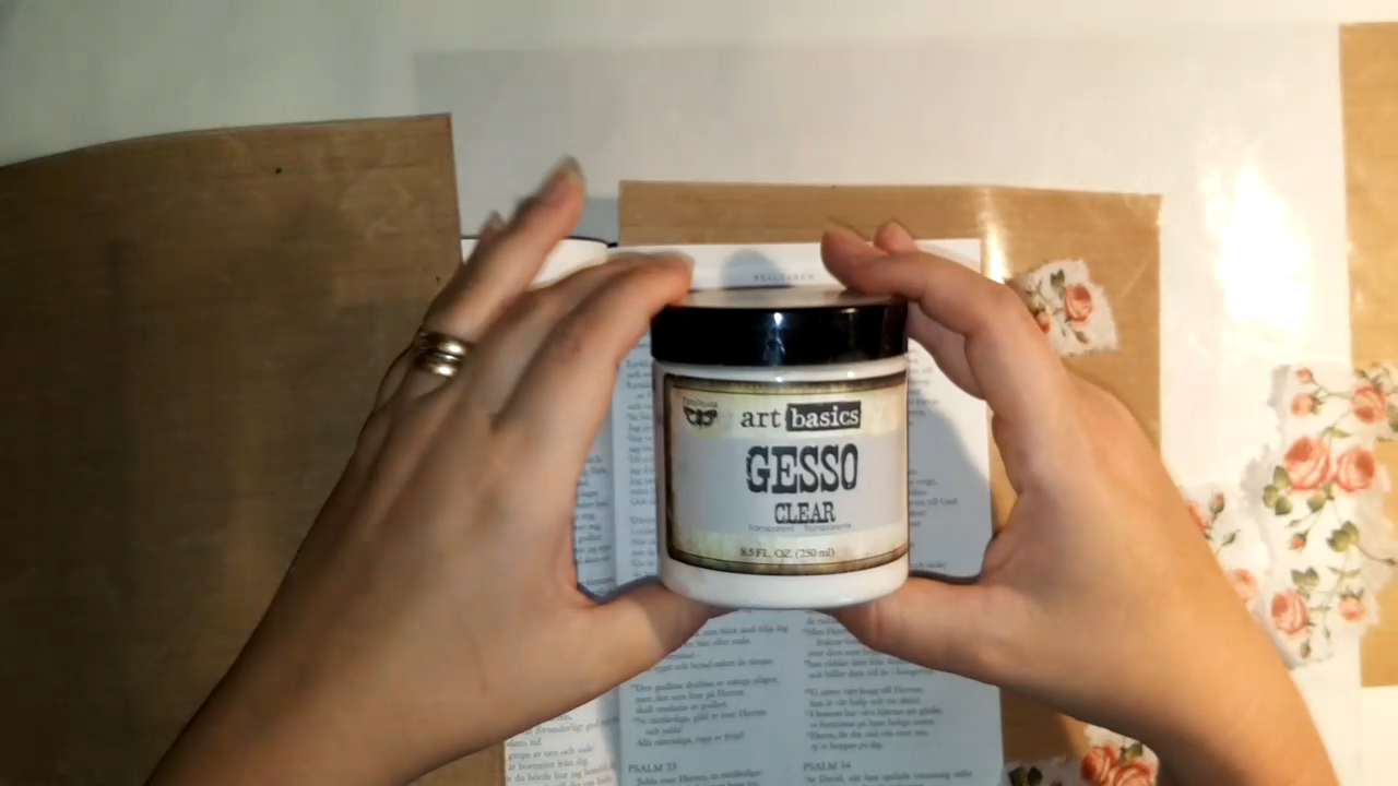 När jag har arrangerat mina blommor och vet hur jag vill ha mina servettdelar är det dags att limma. Oftast när jag har gjort decopage tidigare har jag använt Mod Podge, men jag rekommenderar inte att ni gör det. För det första blir inte ytan helt klibbfri, och för det andra är (min) Mod Podge blank “glossy”. Båda dessa egenskaper leder till att det är stor risk att sidorna i din bibel klistrar ihop sig. Det finns många lim och medium man kan använda. Jag kommer idag använda min vanliga Art Basics Clear Gesso, som jag använder nästan jämt för att grunda sidorna i min bibel. Den fungerar utmärkt för detta, och det är ett basmedium för alla som vill använda mer än typ färgpennor i sin bible journaling, och sist men inte minst: det går utmärkt att måla, stämpla, rita mm på gesson utan att oroa sig för att färgen blöder igenom eller inte fastnar.